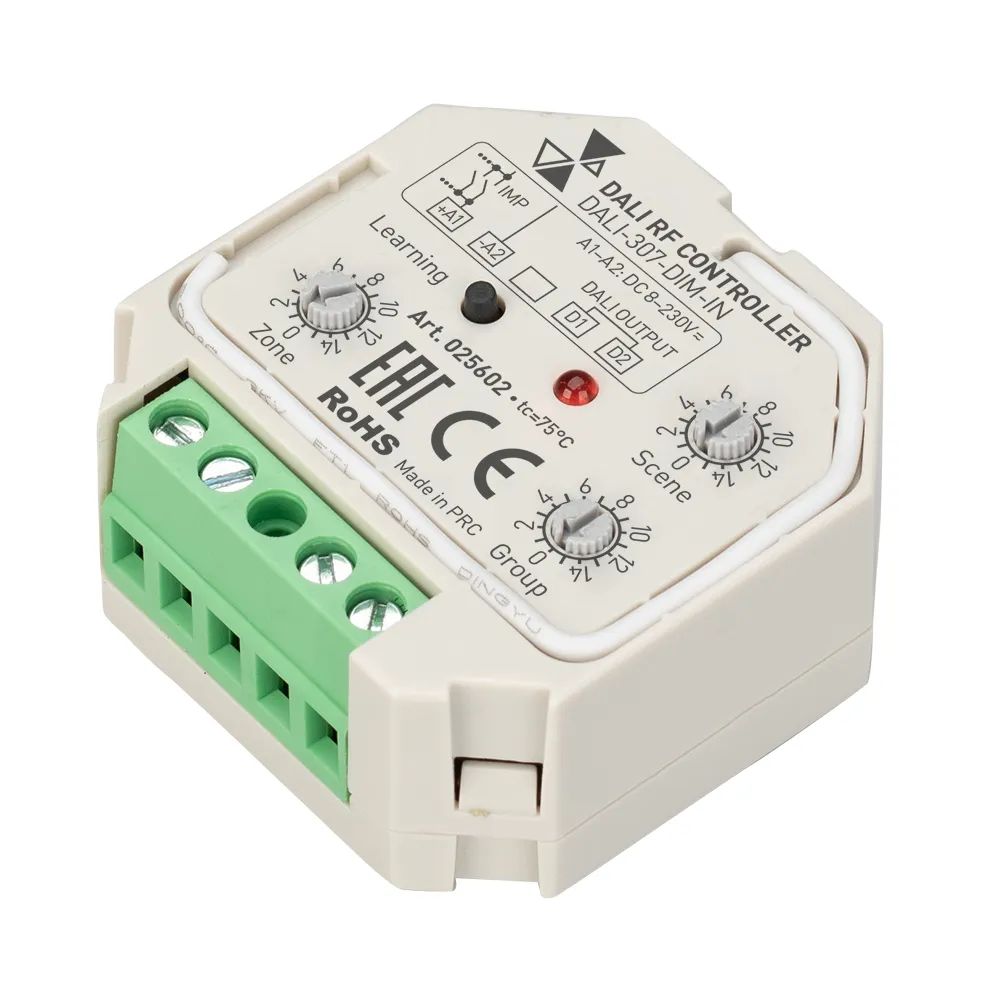 Конвертер предназначен для транслирования команд от радиопультов и панелей серии Excellent в шину DALI. Устройство может управлять стандартными диммерами DALI для одноцветных источников света: светодиодной ленты, светодиодных светильников и других источников света, управляемых по DALI. Конвертер управляет одной группой DALI и включает до 4-х сцен (в зависимости от типа используемого пульта). Возможна работа в широковещательном режиме (Broadcast). Режим работы устанавливается вращающимися переключателями на корпусе конвертера. Наличие входа PUSH-Switch позволяет подключить внешнюю кнопку или настенный выклоючатель. Питание устройства от шины DALI, внешнее питание не требуется. Габариты конвертера составляют 45.5x45x20.3мм, корпус белого цвета, удобная установка в стандартную монтажную коробку.