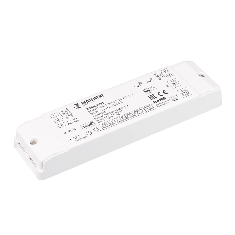 Конвертер предназначен для транслирования команд от RF и Wi-Fi (TUYA) сигнала в шину DALI. Интерфейс DALI DT8. Устройство может управлять стандартными диммерами DALI для DIM/MIX/RGB/RGBW/RGBW-MIX источников света: светодиодной ленты, светодиодных светильников и других источников света, управляемых по DALI. Поддерживает управление от радиочастотных пультов дистанционного управления и настенных панелей управления серии SMART. Наличие клемм Push-Dim для управления с помощью возвратных нажимных выключателей. Режим работы устанавливается вращающимися переключателями на корпусе конвертера. Управление при помощи приложения Intellegent Arlight/Smart Life, а так же Яндекс.Алисы. Питание устройства 230В. Габариты конвертера составляют 140х38х20.5 мм, корпус белого цвета.