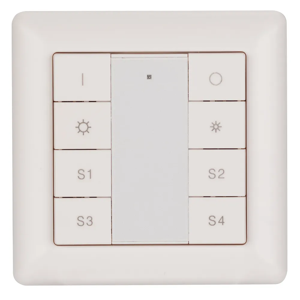 Встраиваемая пластиковая панель белого цвета с кнопочным управлением, предназначенная для управления одноцветными светодиодными лентами, светильниками и другими источниками света в системах управления светом DALI. Позволяет включать/выключать свет в одной группе, менять его яркость, сохранять и вызывать до 4 световых сцен. Установка номера группы и сцен выполняется переключателями на задней стороне панели. Устройство совместимо с диммерами стандарта DALI. Передача команд от панели к диммерам выполняется по общей двухпроводной шине DALI. Удобное и точное управление при помощи отдельных механических кнопок для каждой функции. Питание от шины DALI. Габариты устройства составляют 81х81х22.5 мм. Панель совместима с декоративными рамками ведущих мировых производителей (GIRA, JUNG, BERKER, MERTEN). Стандартная рамка входит в комплект поставки.