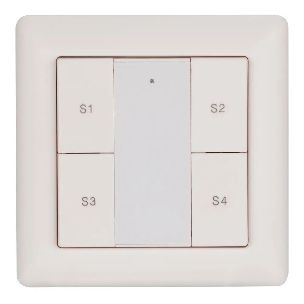 Встраиваемая пластиковая панель белого цвета с кнопочным управлением, предназначенная для включения и выключения световых сцен в системах управления светом DALI. Позволяет включать/выключать световые сцены в одной группе или для всех подключенных исполнительных устройств (Broadcast). Установка номера группы и сцен выполняется переключателями на задней стороне панели. Поддерживает управление 4 сценами. Устройство совместимо с диммерами стандарта DALI. Передача команд от панели к диммерам выполняется по общей двухпроводной шине DALI. Удобное и точное управление при помощи отдельных механических кнопок для каждой функции. Питание от шины DALI. Габариты устройства составляют 81х81х22.5 мм, установка в стандартную монтажную коробку. Панель совместима с декоративными рамками ведущих мировых производителей (GIRA, JUNG, BERKER, MERTEN). Стандартная рамка входит в комплект поставки.