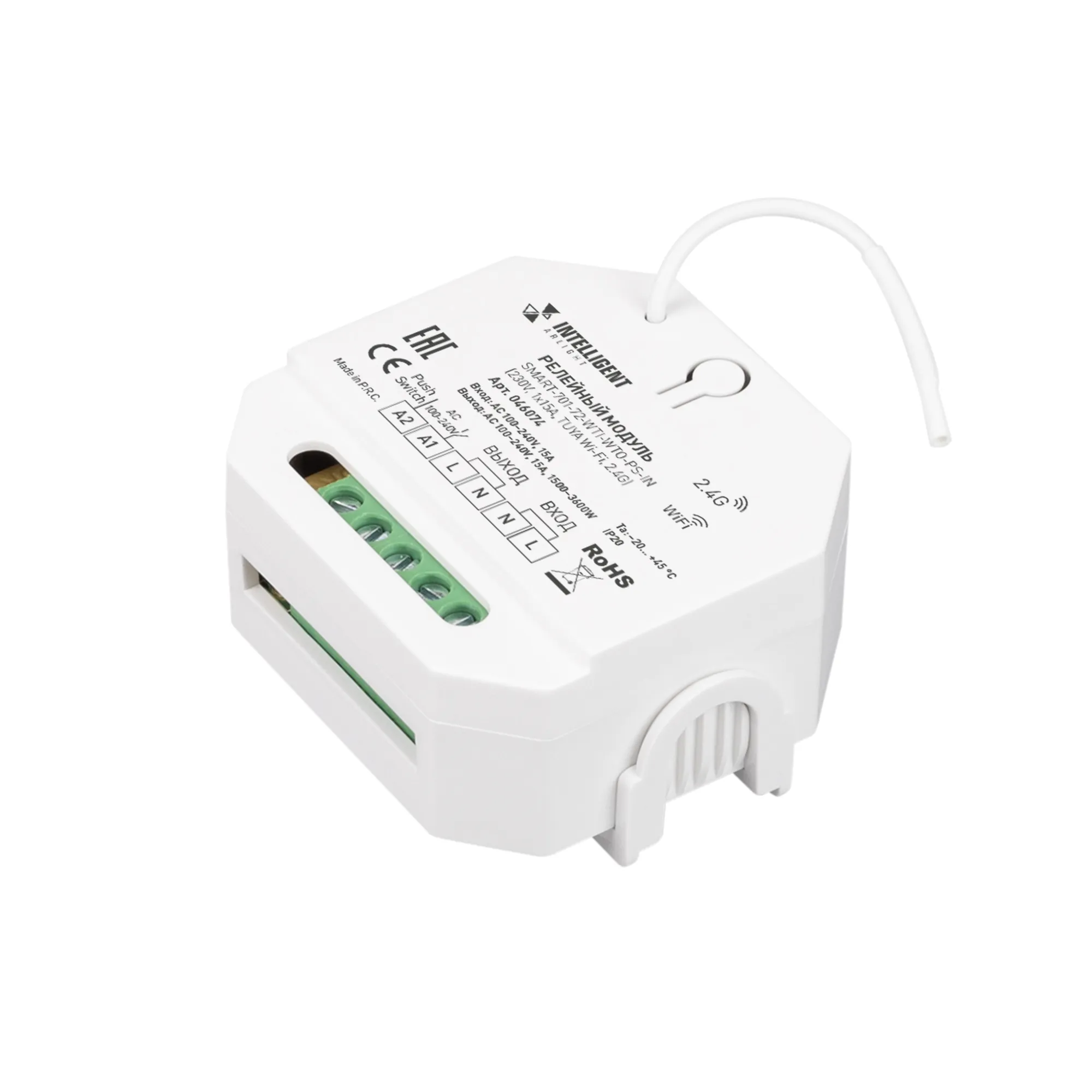 Релейный модуль предназначен для управления источниками света с напряжением питания 230В. Имеет интерфейс TUYA Wi-Fi, управление со смартфона доступно через приложение INTELLIGENT ARLIGHT или Smart Life. Устройство совместимо с радиочастотными пультами дистанционного управления и настенными панелями управления серии SMART. Возможна привязка до 10 пультов или панелей управления. Устройство имеет клеммы Push-Switch для управления с помощью возвратных нажимных выключателей. Питание от 230В, 1 канал управления, максимальная нагрузка 15А на канал, выходная мощность 3600 Вт (в зависимости от напряжения питания). Габариты устройства 56x49.5x28 мм. Удобное размещение внутри подрозетника, в комплекте скоба для монртажа на DIN-рейку.