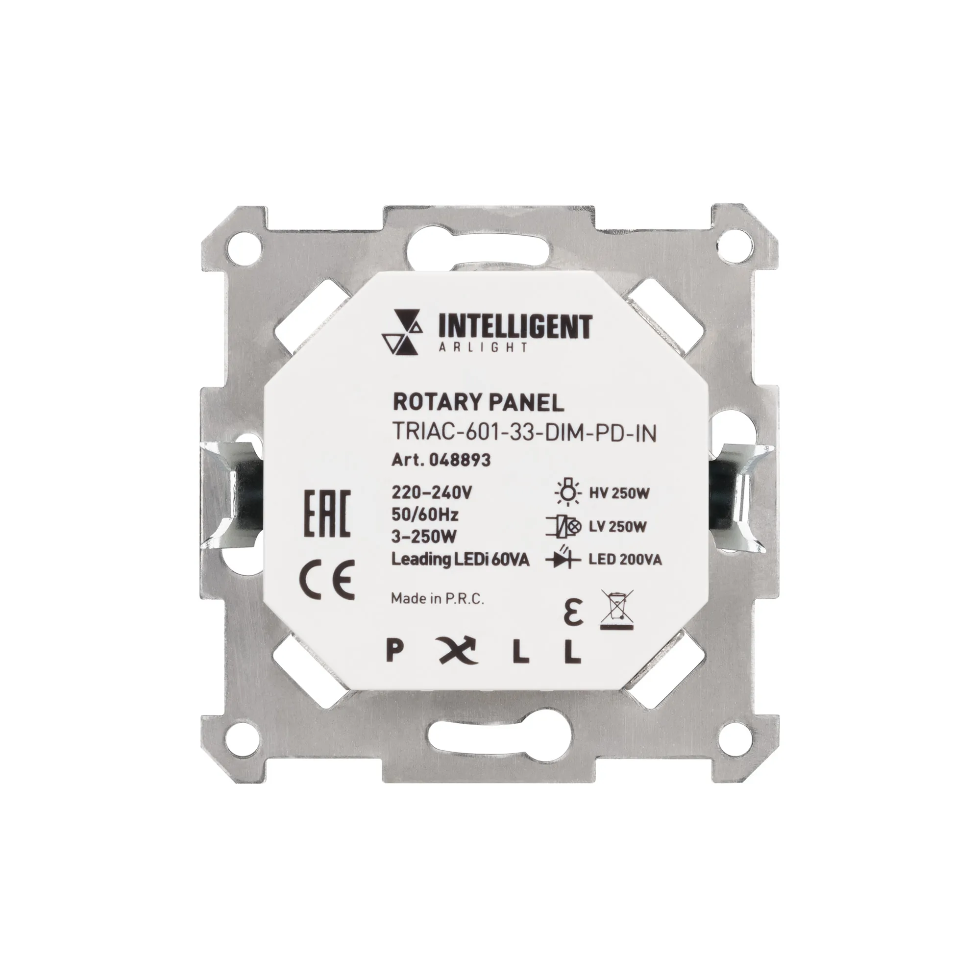 Встраиваемая роторная панель, предназначенная для управления светодиодными или другими источниками света с напряжением питания 230В. Панель позволяет включать и выключать свет и регулировать его яркость. Есть регулировка ограничения минимального и максимального уровня яркости. Не требует подключения N провода. Работает в режимах Leading Edge / Trailing Edge, диммирование по переднему / заднему фронту, выбор режима производится с помощью DIP-переключателя на корпусе. Клеммы Push-Dim для управления с помощью возвратных нажимных выключателей. Удобное и точное управление при помощи вращающегося регулятора. Устанавливается в стандартную монтажную коробку. Декоративная накладка в комплект не входит. Механизм совместим с большинством европейских производителей электроустановочных изделий. Питание 230В, максимальная мощность для ламп накаливания 250 Вт в режиме TE, для светодиодных источников света 200 ВА в режиме TE. Габариты устройства 70.6х70.6х35 мм.