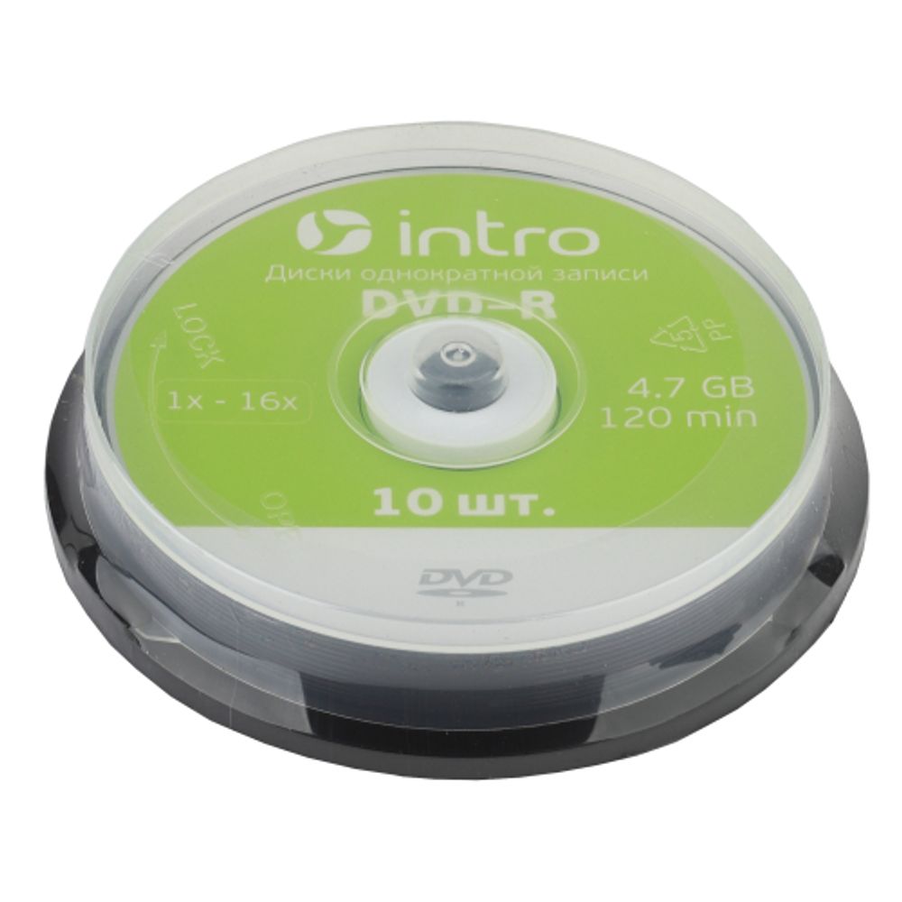 DVD-R INTRO 16X 4,7GB. Упаковка Cakebox 10 шт. Поликарбонат, серебро, оптический краситель.