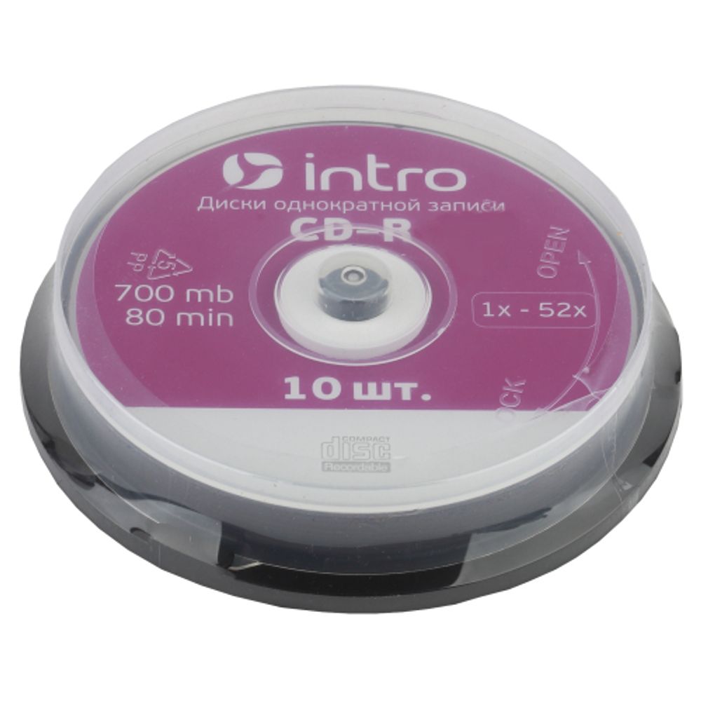 СD-R INTRO 52X 700MB. Упаковка Cakebox 10 шт. Поликарбонат, серебро, оптический краситель.
