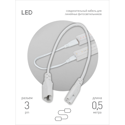 Данный кабель предназначен для соединения линейных светильников с электрической сетью и позволяет увеличить длину питающего кабеля. Его длина составляет три метра, что обеспечивает удобство при размещении светильников в нужном месте.
