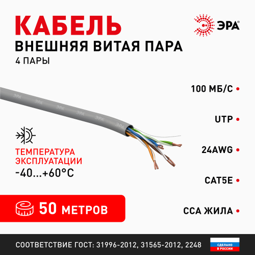 Кабель U/UTP 4x2x24 AWG Cat5e CCA PVC 305м ЭРА SIMPLE применяется для построения компьютерных и информационных сетей, телефонии и цифрового телевидения внутри и вне помещений при защите от осадков и солнечного излучения.. Общие характеристики: Материал токопроводящей жилы - алюминий плакированный медью Тип проводников: Одножильный Диаметр токопроводящей жилы: 0,50+/-0,02 мм,(калибр 24AWG) Материал изоляции жилы: полиэтилен высокой плотности (HDPE) Диаметр по изоляции: 0,90мм Экранирование: UTP (U/UTP) без экрана Материал оболочки кабеля: ПВХ (PVC- поливинилхлорид) Толщена оболочки: 0,50 +/-0,02 мм Диаметр кабеля по оболочке: 5,1 мм Температура прокладки не ниже: -10 С Диапазон рабочей температуры: от -40 до +60 С Радиус изгиба при прокладке: не менее 8 наружных диаметров кабеля Радиус изгиба при эксплуатации: не менее 4 наружных диаметров кабеля Полоса пропускания: от 1 до 100 МГц Напряжение постоянного тока: до 72 В Бухтовка: 50 метров