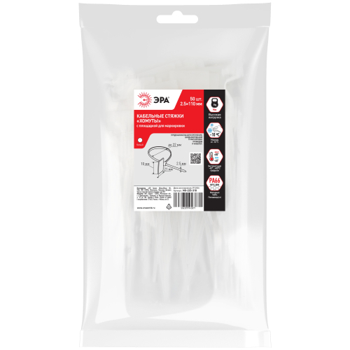 Кабельные стяжки (хомуты) ЭРА с площадкой для маркировки обладают неразъёмным замковым механизмом одностороннего действия. Применяются для крепления, бандажирования проводов и кабелей. Оснащены маркировочной площадкой, позволяющей наносить дополнительную информацию с использованием обычного маркера.