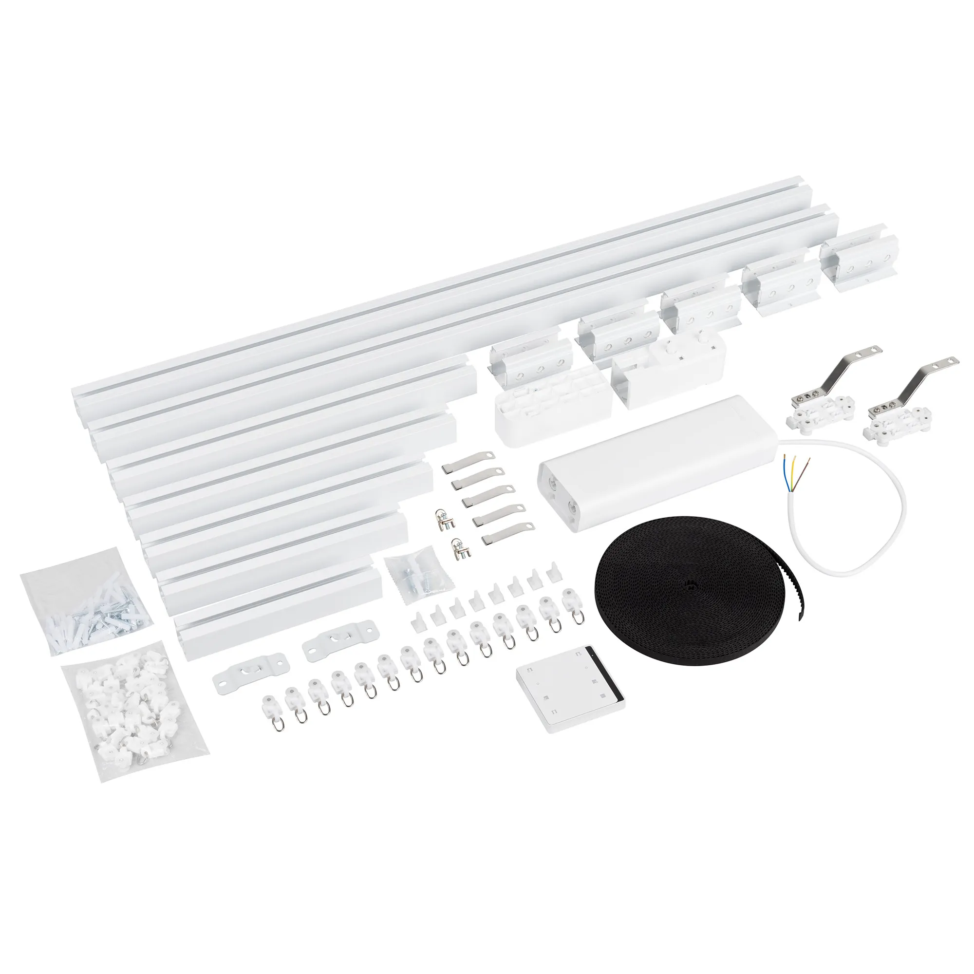 Полный комплект электрокарниза из металлического профиля с мотором. Независимое управление двух сторон, возможность сдвигать центр штор. Готовое решение для установки карниза, который будет управляться дистанционно панелью, либо вручную. Возможность выбора нужной длины благодаря наборным частям.