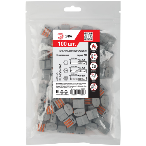 Универсальные клеммы 222 серии с рычагами ЭРА предназначены для многократного соединения всех типов проводников (медных одножильных и многожильных, оконцованных втулочными наконечниками НШвИ) без использования специального инструмента. При подсоединении проводников с изолированными наконечниками НШвИ их макс. сечение должно быть на один размер меньше максимального сечения клеммы.