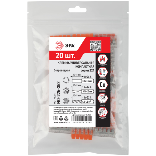 Универсальные компактные клеммы 221 серии с рычагами ЭРА предназначены для многократного соединения всех типов проводников (медных одножильных и многожильных, оконцованных втулочными наконечниками НШвИ) без использования специального инструмента. При подсоединении проводников с изолированными наконечниками НШвИ их макс. сечение должно быть на один размер меньше максимального сечения клеммы.