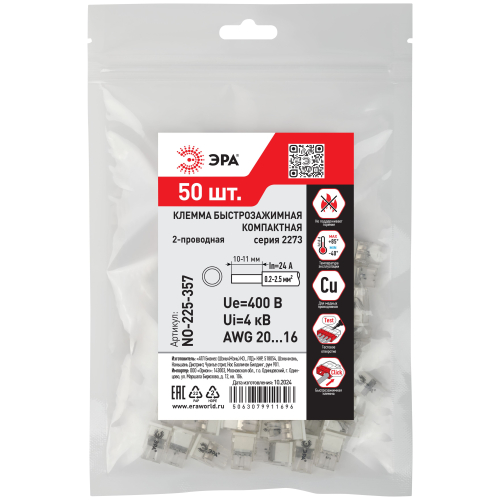 Быстрозажимные компактные клеммы 2273 серии ЭРА предназначены для однократного подключения медных одножильных проводников без использования специального инструмента. Применяются для быстрого и удобного соединения и разводки проводников в распределительных коробках, а также для подключения осветительного и другого электрооборудования в условиях ограниченного пространства.