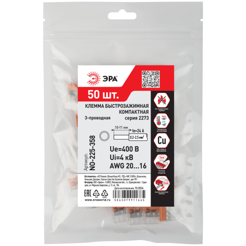 Быстрозажимные компактные клеммы 2273 серии ЭРА предназначены для однократного подключения медных одножильных проводников без использования специального инструмента. Применяются для быстрого и удобного соединения и разводки проводников в распределительных коробках, а также для подключения осветительного и другого электрооборудования в условиях ограниченного пространства.