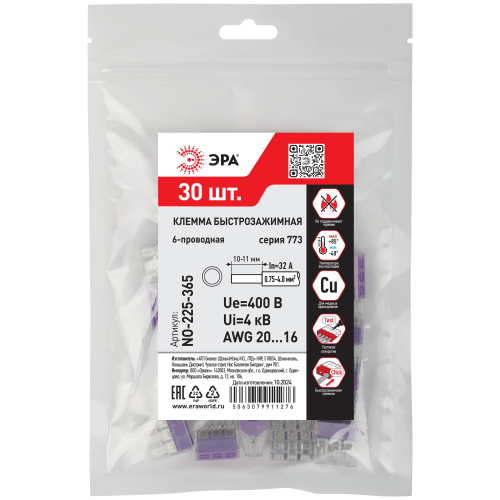 Быстрозажимные клеммы 773 серии ЭРА предназначены для однократного подключения медных одножильных проводников без использования специального инструмента. Применяются для быстрого и удобного соединения и разводки проводников в распределительных коробках, а также для подключения электрооборудования, имеющего повышенного до 7 кВт (32А, 220В) энергопотребление.