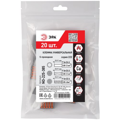 Универсальные клеммы 222 серии с рычагами ЭРА предназначены для многократного соединения всех типов проводников (медных одножильных и многожильных, оконцованных втулочными наконечниками НШвИ) без использования специального инструмента. При подсоединении проводников с изолированными наконечниками НШвИ их макс. сечение должно быть на один размер меньше максимального сечения клеммы.