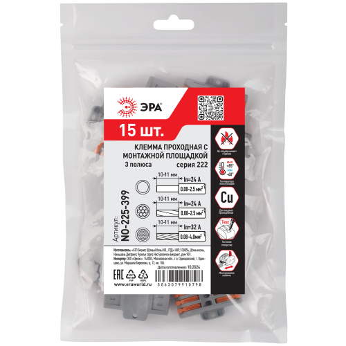 Универсальные проходные клеммы с монтажной площадкой 222 серии с рычагами ЭРА предназначены для создания многократных соединений всех типов проводников (медных одножильных и многожильных, оконцованных втулочными наконечниками НШвИ) без использования специального инструмента. При подсоединении проводников с изолированными наконечниками НШвИ их макс. сечение должно быть на один размер меньше максимального сечения клеммы.