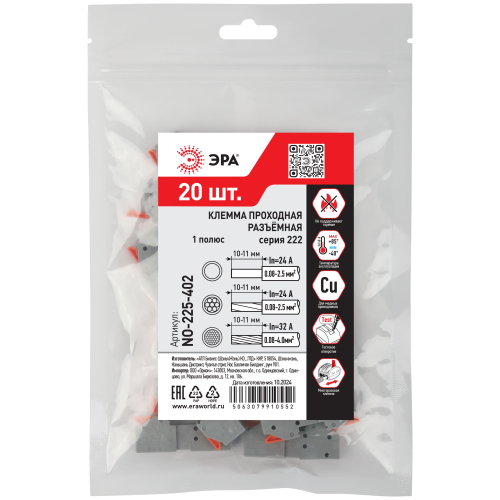 Универсальные проходные разъёмные клеммы 222 серии с рычагами ЭРА предназначены для создания многократных разъёмных соединений всех типов проводников (медных одножильных и многожильных, оконцованных втулочными наконечниками НШвИ) без использования специального инструмента.