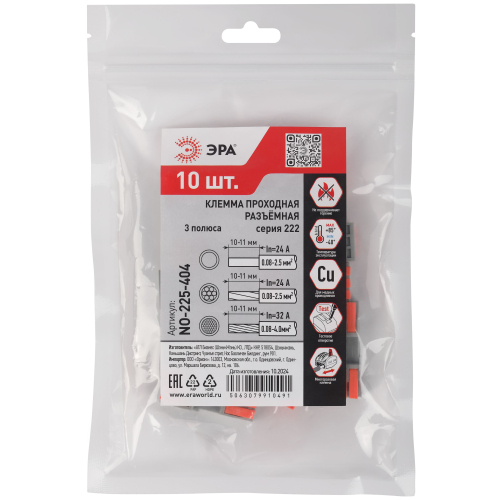 Универсальные проходные разъёмные клеммы 222 серии с рычагами ЭРА предназначены для создания многократных разъёмных соединений всех типов проводников (медных одножильных и многожильных, оконцованных втулочными наконечниками НШвИ) без использования специального инструмента.