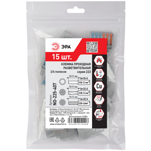 Универсальные проходные разветвительные клеммы 222 серии с рычагами ЭРА предназначены для создания многократных соединений и размножения контактов всех типов проводников (медных одножильных и многожильных, оконцованных втулочными наконечниками НШвИ) без использования специального инструмента.