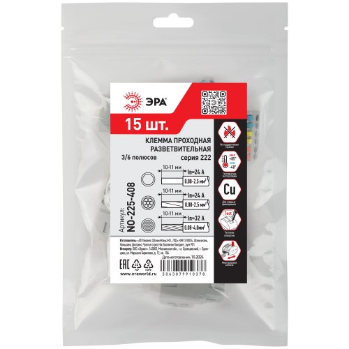 Универсальные проходные разветвительные клеммы 222 серии с рычагами ЭРА предназначены для создания многократных соединений и размножения контактов всех типов проводников (медных одножильных и многожильных, оконцованных втулочными наконечниками НШвИ) без использования специального инструмента.