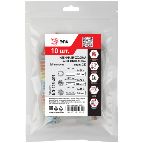Универсальные проходные разветвительные клеммы 222 серии с рычагами ЭРА предназначены для создания многократных соединений и размножения контактов всех типов проводников (медных одножильных и многожильных, оконцованных втулочными наконечниками НШвИ) без использования специального инструмента.