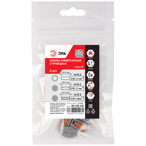 Универсальные клеммы 222 серии с рычагами ЭРА предназначены для многократного соединения всех типов проводников (медных одножильных и многожильных, оконцованных втулочными наконечниками НШвИ) без использования специального инструмента. При подсоединении проводников с изолированными наконечниками НШвИ их макс. сечение должно быть на один размер меньше максимального сечения клеммы.