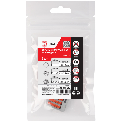 Универсальные клеммы 222 серии с рычагами ЭРА предназначены для многократного соединения всех типов проводников (медных одножильных и многожильных, оконцованных втулочными наконечниками НШвИ) без использования специального инструмента. При подсоединении проводников с изолированными наконечниками НШвИ их макс. сечение должно быть на один размер меньше максимального сечения клеммы.