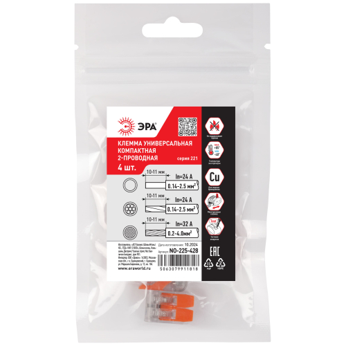 Универсальные компактные клеммы 221 серии с рычагами ЭРА предназначены для многократного соединения всех типов проводников (медных одножильных и многожильных, оконцованных втулочными наконечниками НШвИ) без использования специального инструмента. При подсоединении проводников с изолированными наконечниками НШвИ их макс. сечение должно быть на один размер меньше максимального сечения клеммы.