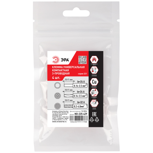 Универсальные компактные клеммы 221 серии с рычагами ЭРА предназначены для многократного соединения всех типов проводников (медных одножильных и многожильных, оконцованных втулочными наконечниками НШвИ) без использования специального инструмента. При подсоединении проводников с изолированными наконечниками НШвИ их макс. сечение должно быть на один размер меньше максимального сечения клеммы.