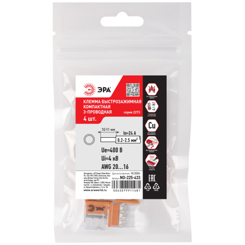 Быстрозажимные компактные клеммы 2273 серии ЭРА предназначены для однократного подключения медных одножильных проводников без использования специального инструмента. Применяются для быстрого и удобного соединения и разводки проводников в распределительных коробках, а также для подключения осветительного и другого электрооборудования в условиях ограниченного пространства.