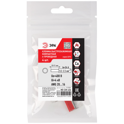 Быстрозажимные компактные клеммы 2273 серии ЭРА предназначены для однократного подключения медных одножильных проводников без использования специального инструмента. Применяются для быстрого и удобного соединения и разводки проводников в распределительных коробках, а также для подключения осветительного и другого электрооборудования в условиях ограниченного пространства.