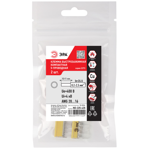 Быстрозажимные компактные клеммы 2273 серии ЭРА предназначены для однократного подключения медных одножильных проводников без использования специального инструмента. Применяются для быстрого и удобного соединения и разводки проводников в распределительных коробках, а также для подключения осветительного и другого электрооборудования в условиях ограниченного пространства.