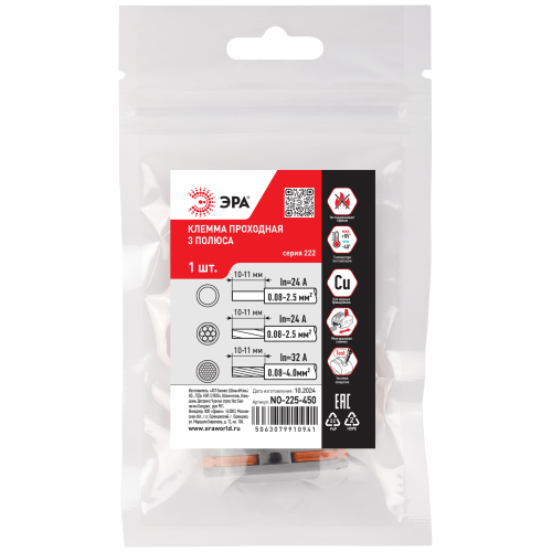 Универсальные проходные клеммы 222 серии с рычагами ЭРА предназначены для создания многократных соединений всех типов проводников (медных одножильных и многожильных, оконцованных втулочными наконечниками НШвИ) без использования специального инструмента. При подсоединении проводников с изолированными наконечниками НШвИ их максимальное сечение должно быть на один размер меньше максимального сечения клеммы.