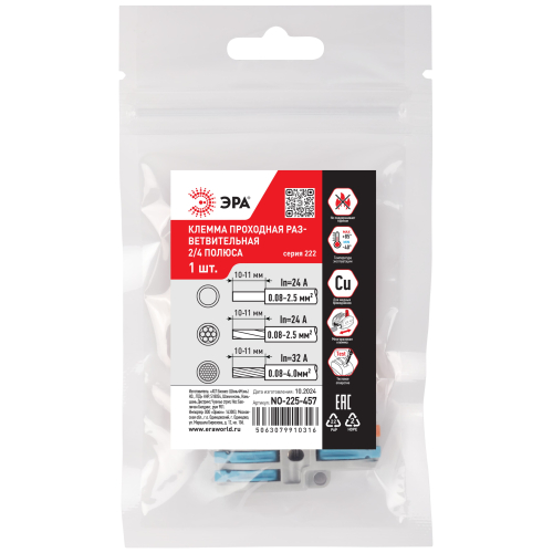 Универсальные проходные разветвительные клеммы 222 серии с рычагами ЭРА предназначены для создания многократных соединений и размножения контактов всех типов проводников (медных одножильных и многожильных, оконцованных втулочными наконечниками НШвИ) без использования специального инструмента.