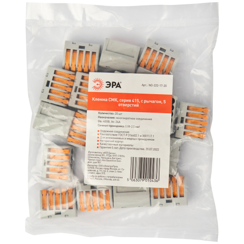 Клеммы СМК с плоско-пружинным зажимом предназначены для многоразового присоединения и ответвления одножильных и многожильных проводников из меди в электрических цепях переменного тока с частотой 50 Гц напряжением до 400 В. Корпус клемм изготовлен из самозатухающего пластика, монтаж не требует использования инструментов. Подходит для многоразового использования. При монтаже необходимо снять изоляцию с проводников в соответствии с обозначениями на корпусе клеммы. Поднимите рычажок, вставьте проводник в гнездо, опустите рычажок в исходное положение.