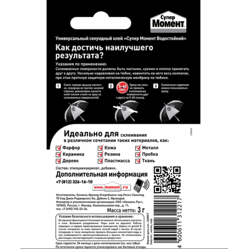 Универсальный надежный секундный клей, отличающийся повышенной устойчивостью в влаге. Выдерживает прямое воздействие воды в течение 3-24 часов. Склеивает мгновенно. Эластичный. Склеенные предметы выдерживают 100 циклов обработки в посудомоечной машине. Клей производится в Ирландии и отвечает всем европейским стандартам качества. Позволяет склеивать различные материалы такие как - пластмасса, резина, кожа, ткань, металл, дерево, пробка, картон, фарфор, керамика, стекло, прочие материалы. Срок годности составляет 24 месяца.