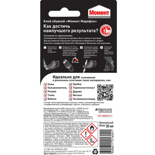 Клей предназначен для склеивания обуви и обувных материалов в различных сочетаниях из резины, термоэластопласта, кожи, кожзаменителей, ткани, войлока, пробки, пластика. Основные свойства: отлично склеивает дерево, металл, поливинилхлорид и другие материалы. Высокая эластичность шва. Водостойкий. Морозостойкий. Надёжная прочность склеивания. Эластичен и устойчив к внешним воздействиям и агрессивной окружающей среде. Не пригоден для склеивания стиропора, полиэтилена, полипропилена, пластифицированного ПВХ.