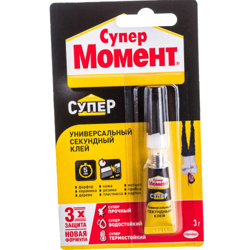 Супер клей Момент 874565 используют для быстрого склеивания таких материалов, как фарфор, керамика, дерево, кожа, резина, металл, пробка, картон и большинство пластиков. В составе данного клея - смола эпоксидная. Склеивание осуществляется всего за 5 секунд. Благодаря прозрачному составу место склеивания совсем незаметно. сверхпрочный клеевой шов выдерживает нагрузку до 200 кг на см2. Хранить необходимо в сухом месте при температуре от -20 ºС до +30 ºС. Поставляется на блистер-карте. Срок годности - 24 месяца.