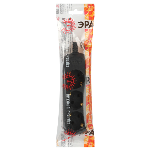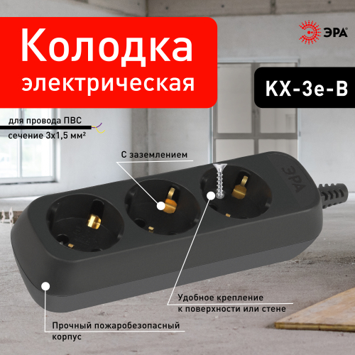 Колодка ЭРА KX-3e-B на 3 розетки, с заземлением, черная. Максимальная мощность - 16 А/3500 Вт. Для кабеля до 3х1,5мм2