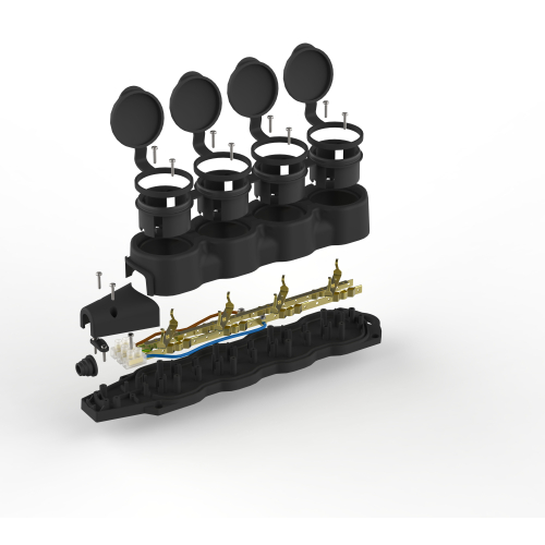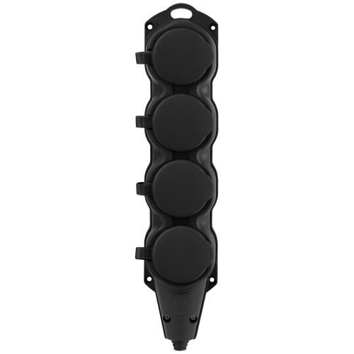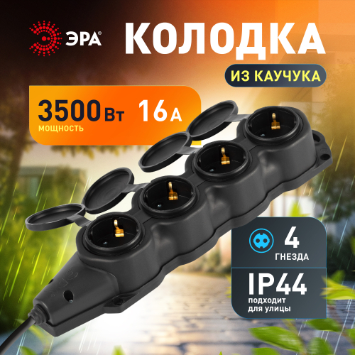 Каучуковая колодка ЭРА KX-4e-B-IP44 4 гнезда, с заземлением, черная, для подключения кабеля (без разбора корпуса). Съёмная крышка. IP44-защита от пыли и влаги. Максимальная мощность 16А/3500Вт. Для кабеля сечением до 3x2,5мм2.