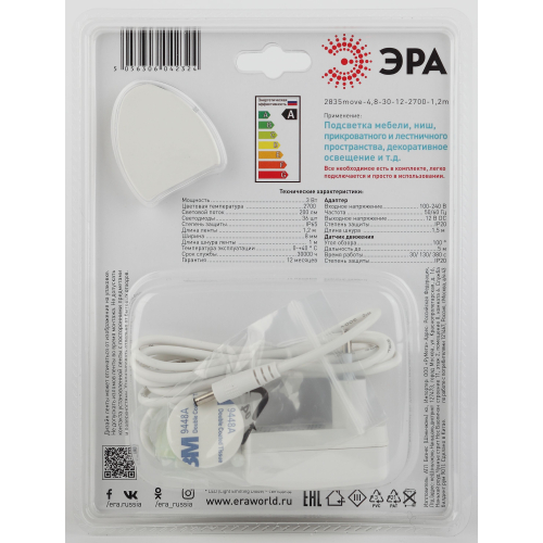 ЭРА Комплект светодиодной ленты 2835move-4,8-30-12-2700-1,2m (30/900) со степенью защиты от пыли и влаги IP65 - идеально подходит для подсветки лестничных и прикроватных пространтств, проходных помещений.