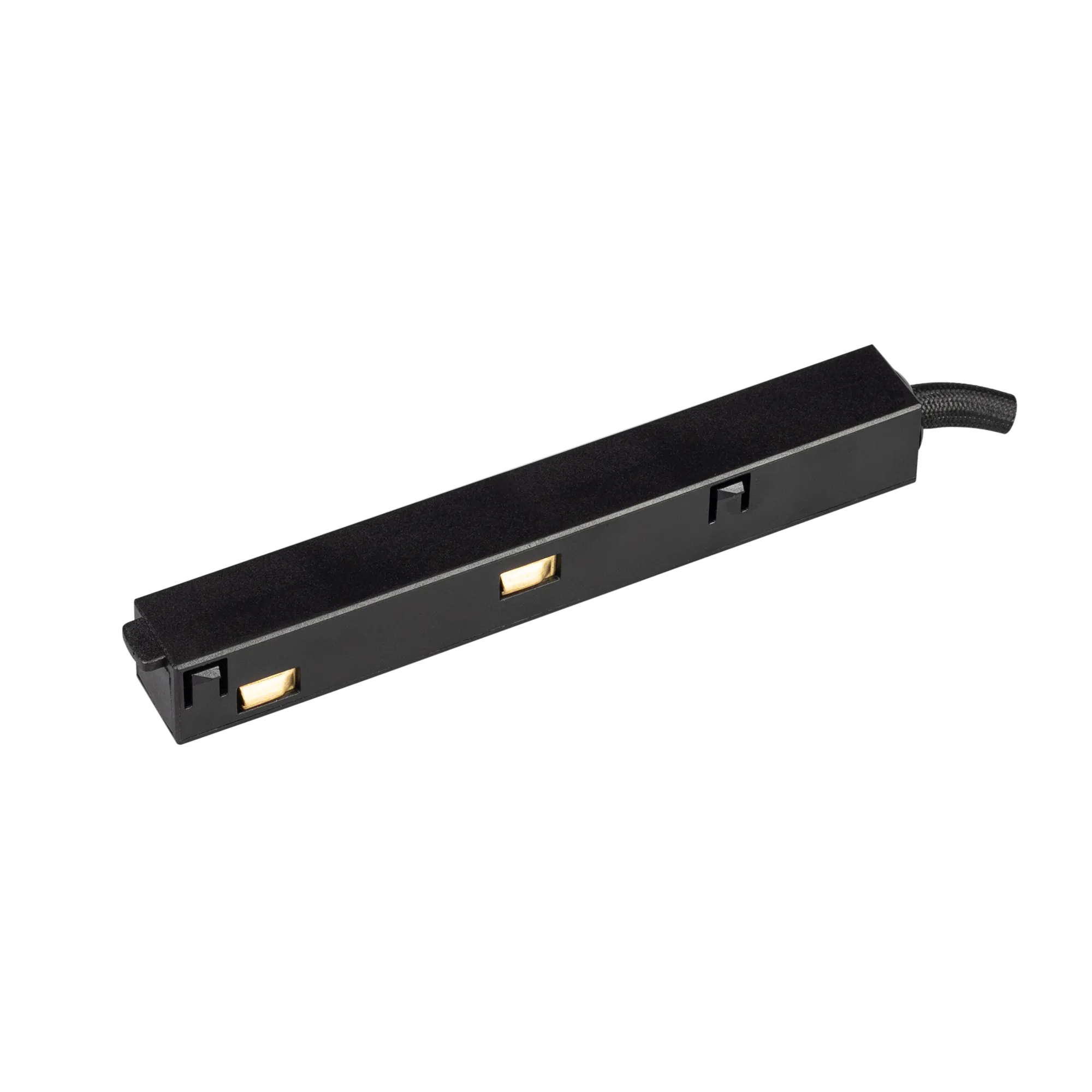Коннектор подвода питания MAG-ORIENT-CON-POWER (BK) черного цвета для треков MAG-ORIENT. Кабель 300 мм в комплекте. Размеры: 129×17×16.5 мм.