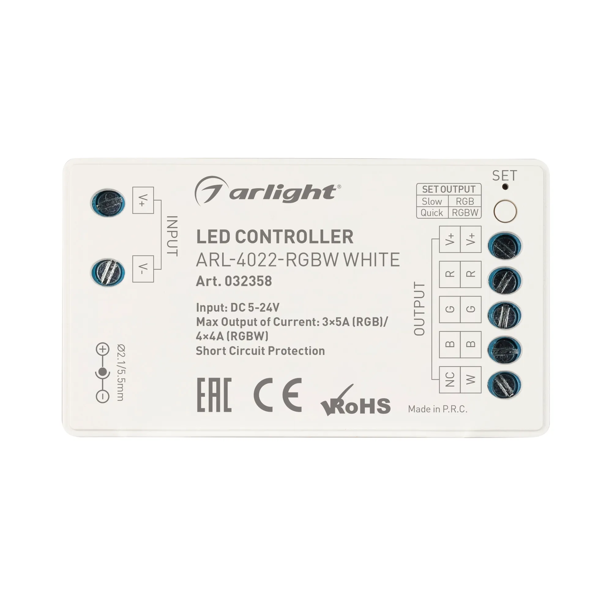 Комплект: 4-канальный диммер с радиопультом белого цвета с 24 кнопками, для управления мультицветными RGB и RGBW светодиодными лентами. Этот комплект устройств позволит легко и удобно регулировать цвет, яркость освещения и осуществлять включение и выключение света. Пульт имеет предустановки цвета, яркости свечения и динамических режимов. Питание диммера имеет диапазон напряжений от 5В до 24В, максимальный ток 5А на 1 канал, максимальная мощность 180-384Вт (в зависимости от напряжения питания).При потере питания диммера последнее состояние яркости и цвета сохраняется. Питание пульта осуществляется от батарейки CR2025. Габариты диммера составляют 70x40x20мм, габариты пульта составляют 85х51х6мм.