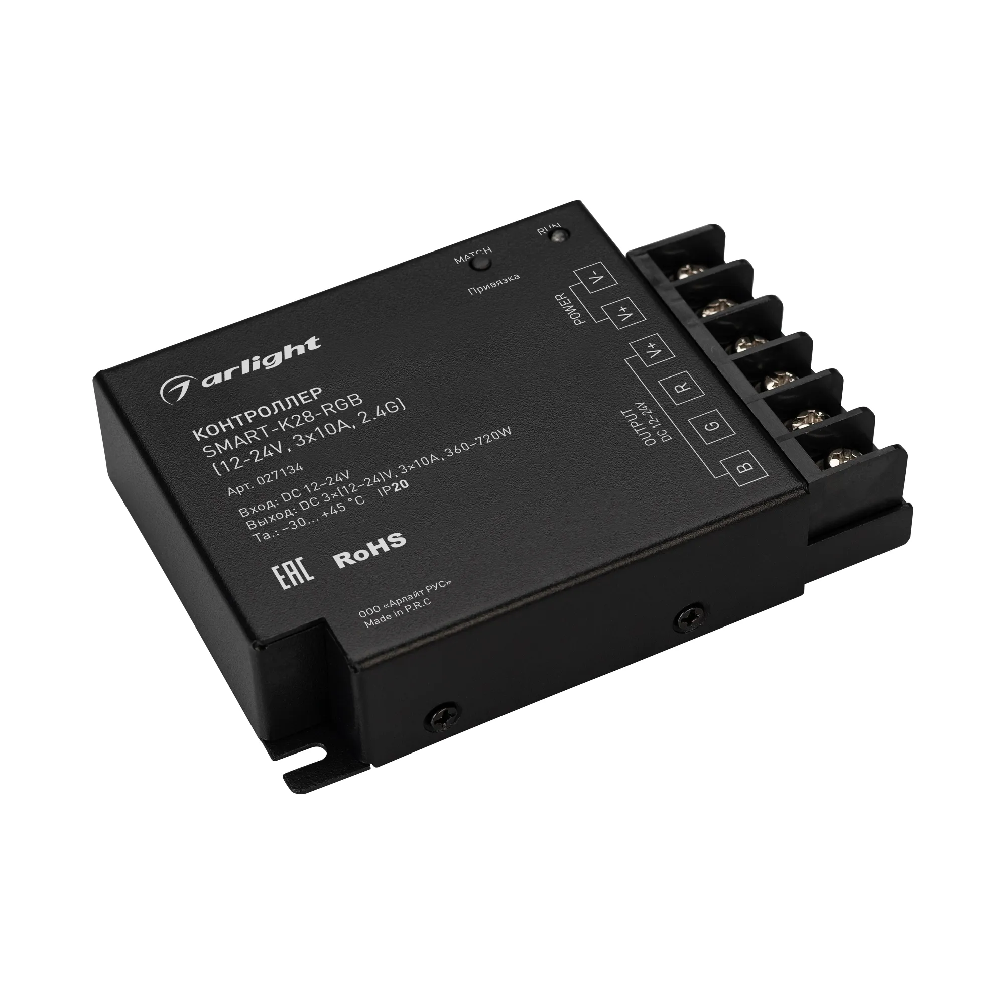 Диммер для управления мультицветными (RGB) светодиодными лентами по ШИМ и другими светодиодными источниками света с напряжением питания 12-24В. Выполняет основные фукнции: включение/выключение, регулировка яркости и цвета. Устройство совместимо с радиочастотными пультами дистанционного управления и настенными панелями управления серии SMART. Возможна привязка до 10 пультов или панелей управления. Питание от 12-24В, 3 канала управления, максимальная нагрузка 10А на канал, выходная мощность 360-720 Вт (в зависимости от напряжения питания). Габариты устройства 110x75x25 мм, металлический корпус черного цвета.