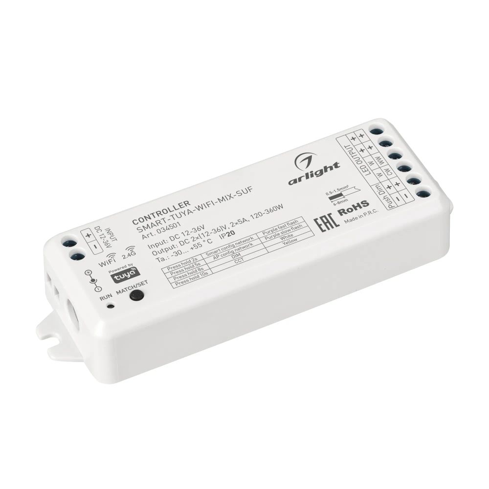 Диммер для управления одноцветной и мультибелой (MIX) светодиодной лентой по ШИМ и другими светодиодными источниками света с напряжением питания 12-36В. Выполняет основные фукнции: включение/выключение, регулировка яркости, изменение цветовой температуры. Cовместим беспроводной облачной платформой TUYA и АЛИСА от ЯНДЕКС. Управление со смартфона через приложение SMART LIFE. Устройство совместимо с радиочастотными пультами дистанционного управления и настенными панелями управления серии SMART. Возможна привязка до 10 пультов или панелей управления. Питание от 12-36В, 2 канала управления, максимальная нагрузка 5А на канал, выходная мощность 120-360 Вт (в зависимости от напряжения питания). Габариты устройства 114x38x20 мм.