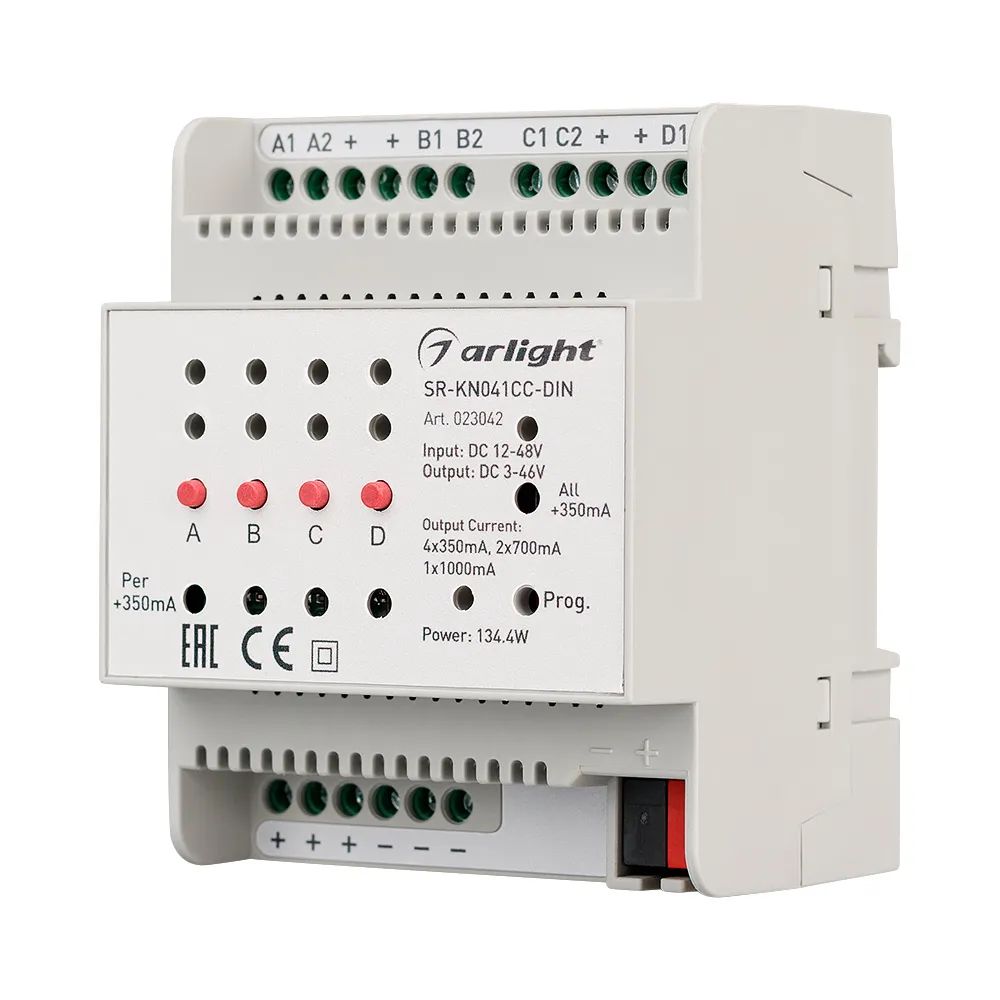 Диммер постоянного тока, предназначенный для управления источниками света в системах стандарта KNX. Позволяет осуществлять включение/выключение, регулировку яркости. Возможно ручное управление, с помощью кнопок на корпусе. Программирование осуществляется через ПО ETS, версии не ниже 3.Х. Напряжение питания 12-48В либо от шины KNX, 4 канала управления, 8 выходов (4 канала по 2 источника света), максимальный ток 8х350 мА / 4х700 мА / 2х1000 мА, максимальная мощность 16.8-134.4Вт. Диммер предназначен для установки на DIN-рейку. Габариты устройства 90х72х64.2 мм. Корпус - пластик.