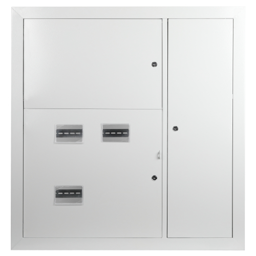 Щиты этажные металлические ТМ ЭРА SIMPLE предназначены для сборки учетно-распределительных устройств в жилых и общественных зданиях, а также для защиты отходящих линий при перегрузках и коротких замыканиях. Сварной металлический корпус состоит из трех отсеков: вводно-учетного, распределительного, отсека слаботочного оборудования. В вводно-учетном и распределительном отсеках размещены перфорированные DIN рейки для крепления счетчиков (по количеству квартир) рейки для крепления модульного оборудования и монтажная панель для крепления отводов от силового кабеля. Отсек слаботочного оборудования снабжен перфорированными DIN рейками и монтажной панелью для удобной прокладки и монтажа систем теле- и радиосетей, телефонных линий, сетей охранной сигнализации, домофонов. Щиты изготовлены из стали 0,8 -1,2 мм, покрыты полиэфирной порошковой краской RAL 7035 . Размер ниши 876х864х125