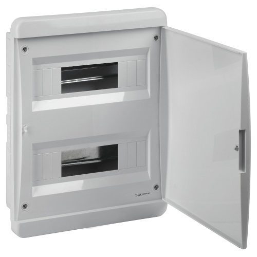 Встраиваемый пластиковый корпус ЭРА COMFORT ЩРВ-П-24 для установки 24 модулей. Дверца закрытого типа (непрозрачная). Предусмотрена регулируемая по глубине DIN-рейка, повышающая удобство монтажа и сборки. Степень защиты — IP40.