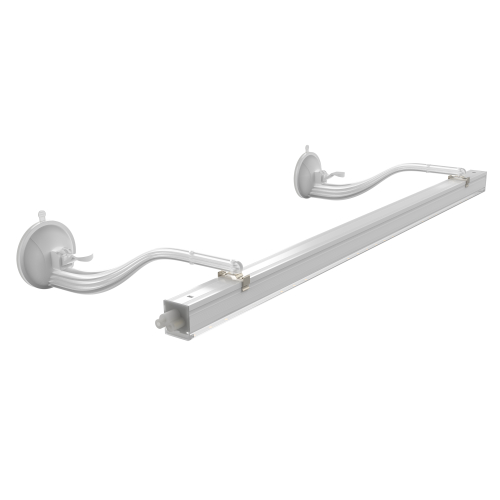 Комплект из двух белых кронштейнов на стекло. Скобы входят в комплект. Возможна двухрядная установка светильников. Кронштейны многоразовые, не требуют сверление поверхности, выполнены из поликарбоната.