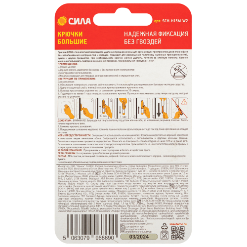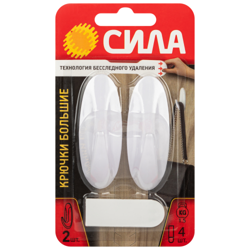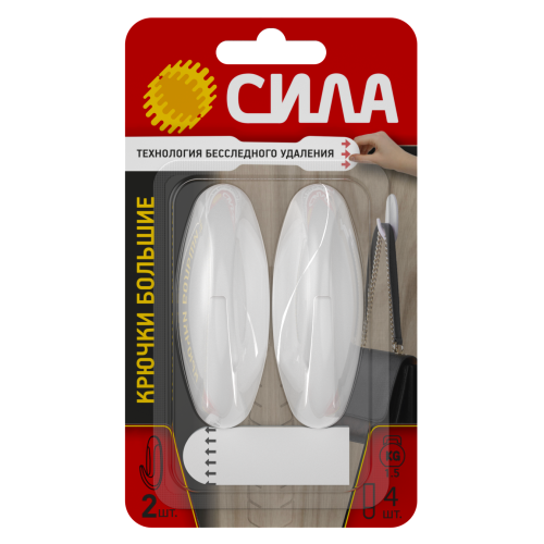 Крючки СИЛА с технологией бесследного удаления предназначены для организации пространства дома или в офисе без использования инструментов и гвоздей. Подходят для размещения полотенец, кухонных принадлежностей, сумок и других предметов. При необходимости крючок можно удалить, потянув за клейкую полоску. Крючок можно использовать повторно со сменной полоской. Максимальная нагрузка: 1,5 кг.