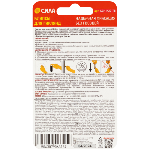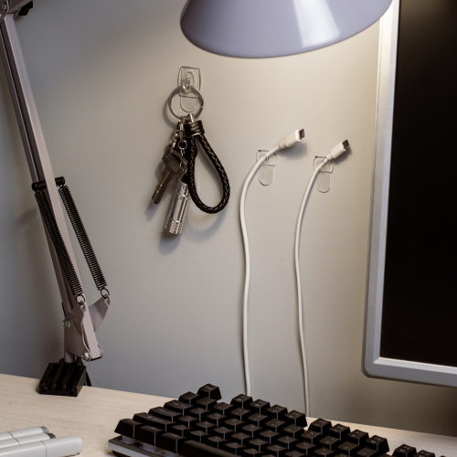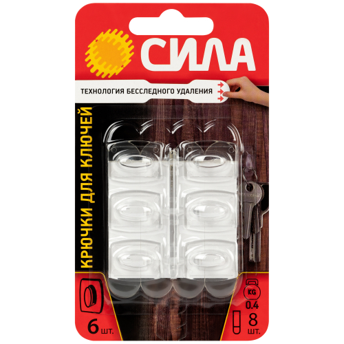 Крючки для ключей СИЛА с технологией бесследного удаления предназначены для крепления брелоков с ключами, декора и проводов. Прозрачные крепления помогут незаметно подчеркнуть декор вашего интерьера. При необходимости крючки можно удалить, потянув за клейкую полоску. Крючки можно использовать повторно со сменными полосками. Максимальная нагрузка: 200 г. Подходят для проводов диаметром до 6 мм. Преимущества: Легкий монтаж. Держит крепко, удаляются без следа и без применения инструментов. Крючки незаметны на поверхности, надежно держат и легко удаляются.Подходит для различных гладких поверхностей, большинства видов обоев, окрашенных стен, дерева, ламината, стекла, металла и плитки.